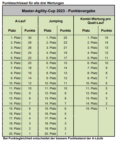 Parcours- und Zeitfehler werden hiervon abgezogen, eine Disqualifikation führt zu 0 Punkten. Bei Punktgleichheit mehrerer Mannschaften wird die Mannschaft mit den meisten Punkten im A-Lauf in der